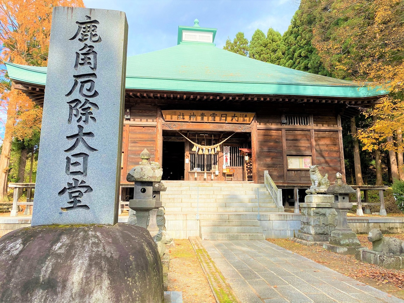 大日霊貴神社は継体天皇十七年(西暦523)に勅願により建立されたことに始まり、元正天皇の養老二年(718)に命により行基が下向し、九間四面の社を新たに建立したとされたと言われており、以来鹿角の地に鎮座しています。通称大日堂として、地域の方々に信仰されています。